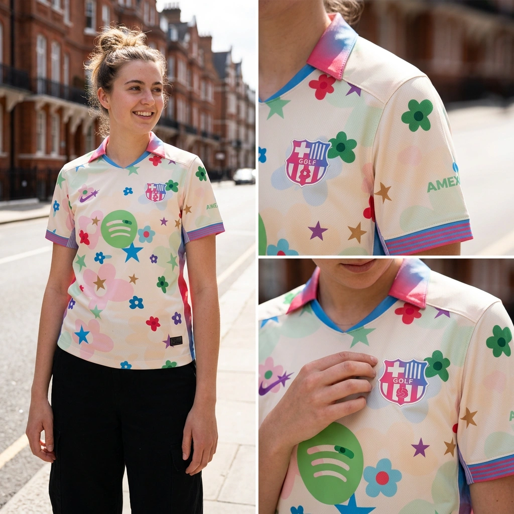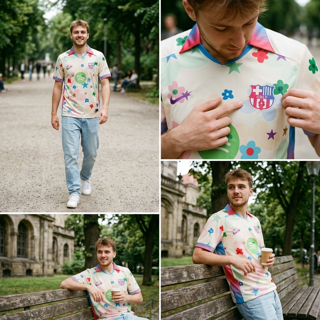 Habe mir das neue Barça x Golf Wang Trikot geholt. Der Style ist echt einzigartig, die Blumen und Sterne sind super cool. Das Material fühlt sich gut an, typisch für diese Art von Trikots. Es fällt ein bisschen kleiner aus als gedacht, aber es passt noch gut. Der Spotify-Druck ist auch top. Ein echtes Sammlerstück! 🔥