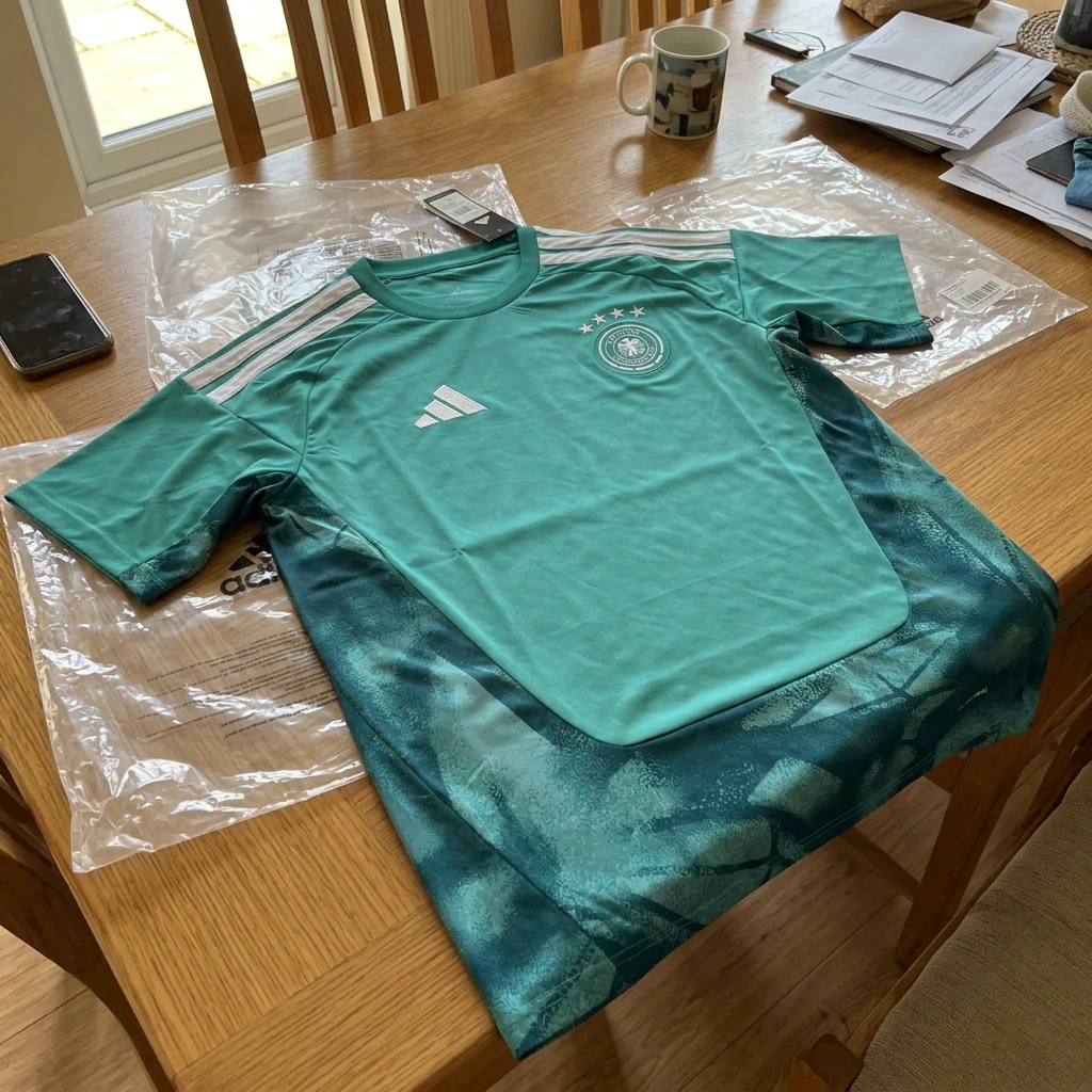 The teal kit is something else. The graphic pattern on the lower part looks sharp, and the fit is spot on for me. It feels very authentic, though the fabric is a bit thinner than I anticipated. Still, a solid addition for any fan. Came in the usual plastic bag, nothing fancy.
