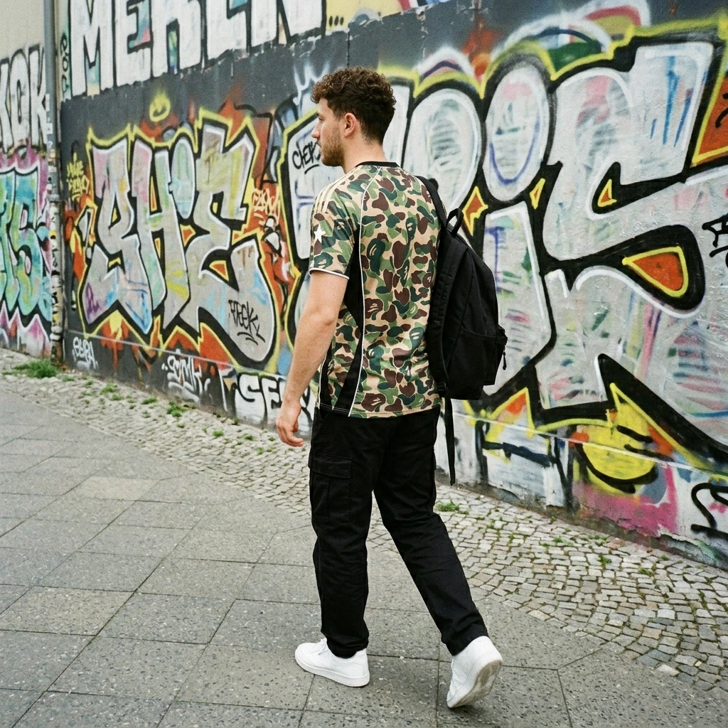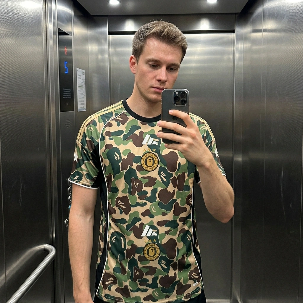 Habe dieses Trikot online gesehen und musste es einfach haben. Das Camouflage-Muster in Kombination mit den goldenen Details sieht in echt noch besser aus als auf den Fotos. Der Stoff fühlt sich super an, sehr leicht und atmungsaktiv, perfekt für den Sommer. Die Passform ist auch top, nicht zu eng und nicht zu weit. Einziges kleines Manko ist, dass die goldenen Streifen auf den Schultern etwas empfindlich wirken, aber das wird sich mit der Zeit zeigen. Insgesamt bin ich sehr zufrieden und kann es nur empfehlen. 🤙