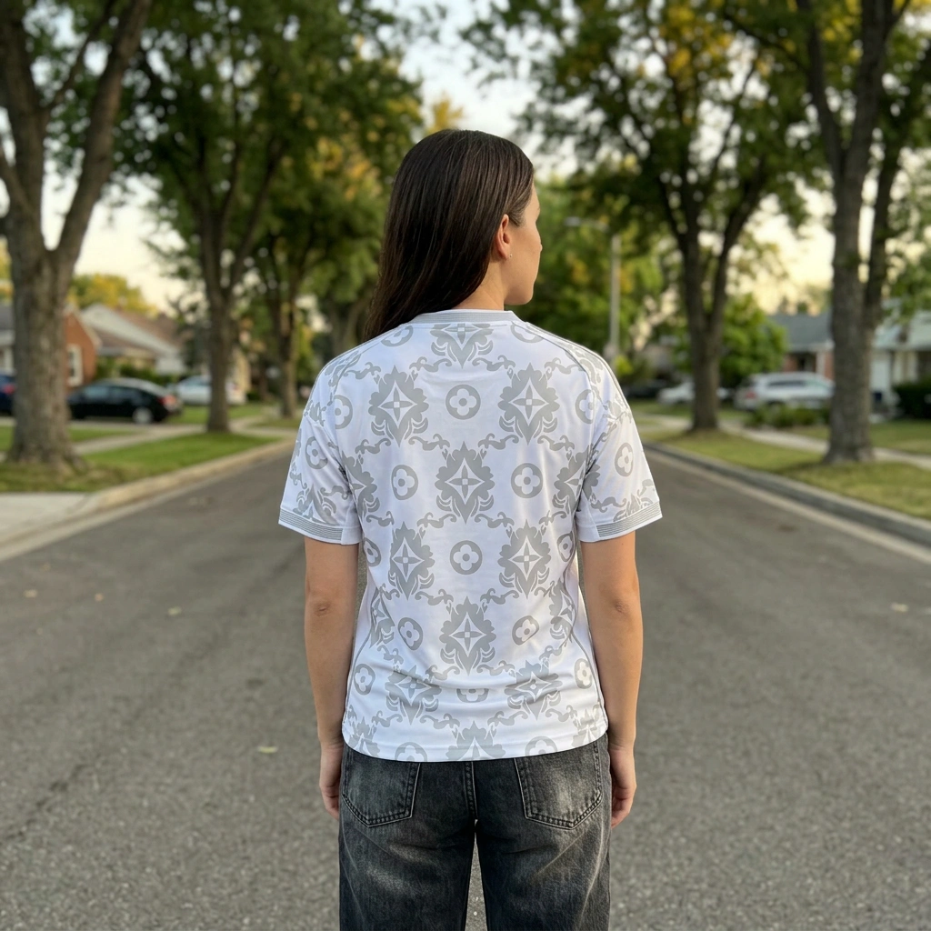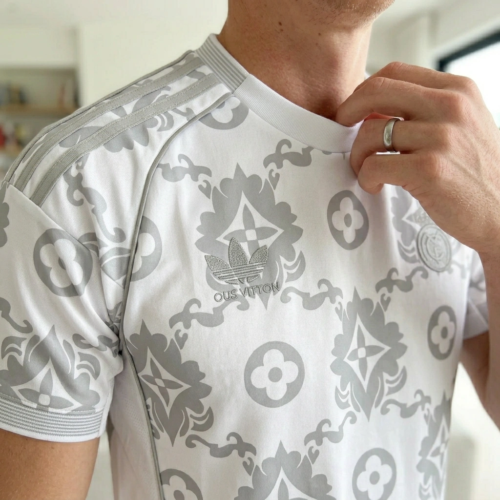 The damask design is unique on a kit, looks classy. Fits well and the material is lightweight. Wish the grey stripes were a bit darker for contrast, but still a solid purchase. 🤍⚽️