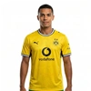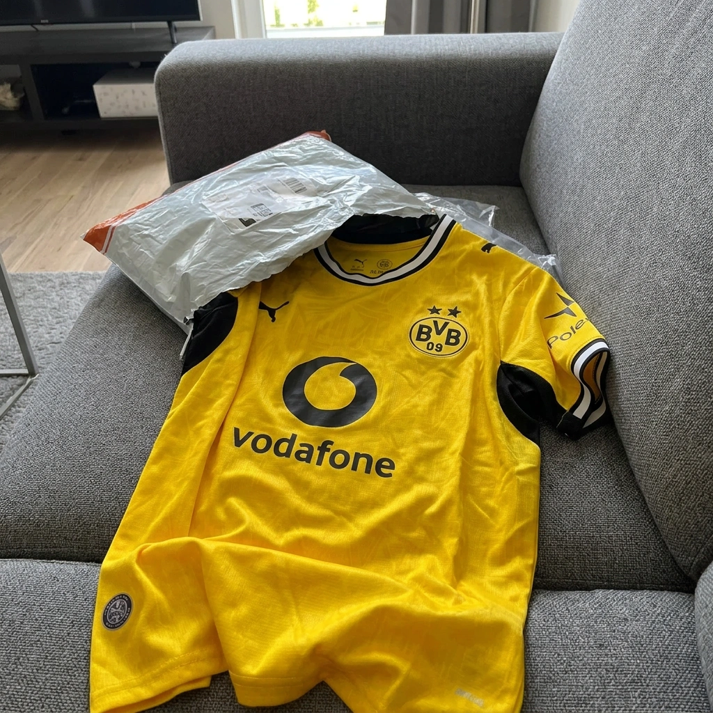 The yellow is very vibrant, just like the pictures. This is the player version, so it is a bit tight; maybe order a size up if you want a looser fit. The quality feels very professional, and all the sponsor logos seem well-applied. Shipping was faster than expected.