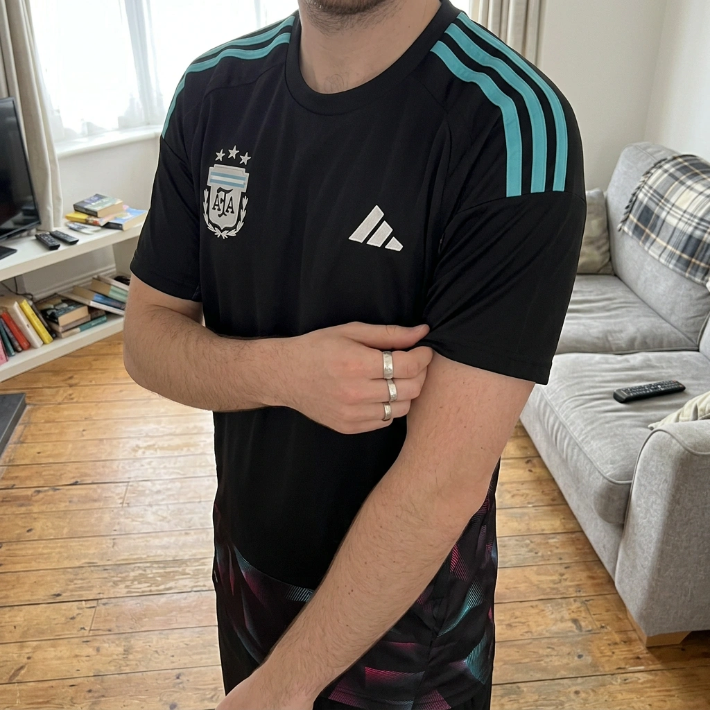 The design is sharp. The black base with the teal and pink patterns really stands out, and the 3 stars are a must-have detail. Fits true to size, though the fabric isn't as premium as the player-issue versions, but that's expected. Solid training top.