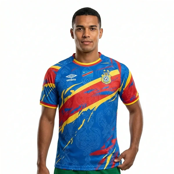 Finally picked up this DRC kit. The colors are even more vivid in person than the stock photos show. The blue pattern is complex and looks sharp. It feels lightweight and breathable. Sizing is pretty standard, maybe a touch loose but good for a football shirt. Took a close-up of the crest, the embroidery is decent. Worth the wait.