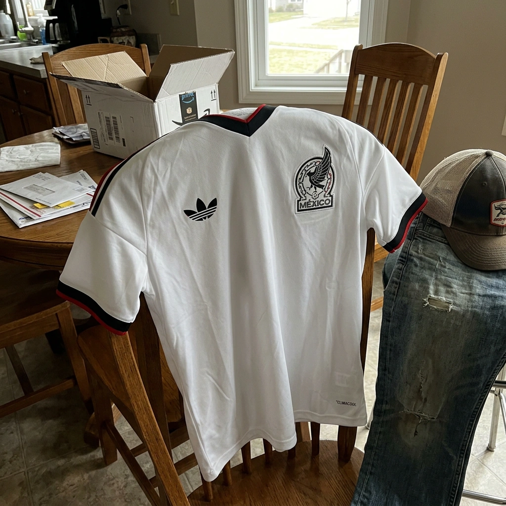 Finally got this for my son's collection. The white is crisp and the red/black trim looks really sharp in person. The Mexico badge is clean. It fits him perfectly, a bit loose which is how he likes it. Material seems good quality too.