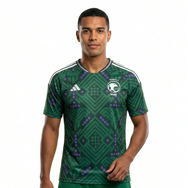 Finally got my hands on this Saudi away shirt. The geometric design is even more striking in person, the green and purple combination is really unique and pops. Fabric feels lightweight and breathable, good for summer. The fit is true to size, a standard Adidas medium fits me perfectly. Stitching on the crest and logos is tidy. A solid addition to the collection.